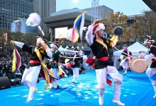 11월 8일(토) 광화문광장 특설무대에서 진행된 대한민국해군 창설 80주년 ‘NAVY WEEK in Seoul’ 특별공연 「골드 네이비, 광화문을 물들이다!」에서 해군 출신 홍보단 전우회인 '홍우회'와 현역 해군홍보대가 사물놀이 공연을 하고 있다